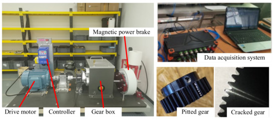 To verify the proposed composite failure model, a two-stage gear drive system test rig has been set up. The two-stage gear drive test system consists of a drive motor, an acceleration sensor, a controller, a gearbox, a magnetic powder brake and a data acquisition system (DT9837, frequency: 8000 Hz). Gear accuracy grade is 8. The cracked gear and pitted gears are shown in Figure 24. The vibration acceleration signal of the gear system can be collected from the accelerometer located at the bearing end plate, and the sampling frequency is 10.24 kHz. The experimental input rotation frequency is 28 Hz. Due to slip in the transmission process, the actual input is about 27.345 Hz, the intermediate shaft rotation frequency is 8.347 Hz, the output shaft rotation frequency is 3.339 Hz, first stage drive frequency is 793.005 Hz, the second stage drive frequency is 300.492 Hz and the load is 4 V (about 16.7 N).