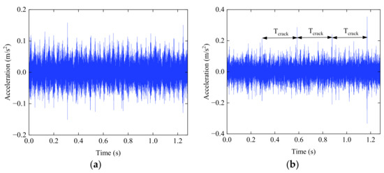 Section 2 obtains the time-varying meshing stiffness of normal gear, cracked gear, pitted gear and gear coupling pitted gear and cracked gear. The Newmark-β method is used to solve the vibration signal results of the two-stage gear system under the conditions of health and failure. The Newmark direct integration method is a generalization of the integral form of linear acceleration method and a simplified algorithm for linear systems with multiple degrees of freedom. When the selected control parameters satisfy a certain relation, the method is unconditionally stable, and the time step size does not affect the stability of the solution. Therefore, this method is used to solve the multi-degree-of-freedom system dynamics in this paper. The basic parameters of the simulation model are as follows: input shaft rotation frequency finput = 28 Hz, intermediate shaft rotation frequency fmiddle = 8.547 Hz and output shaft rotation frequency foutput = 3.419 Hz. The meshing frequencies for the two-stage gear drive are 812 Hz (fm1) and 307.705 Hz (fm2), respectively. The bearing ball passing frequencies are 86 Hz (fb1), 26.2891 Hz (fb2) and 10.516 Hz (fb3), respectively. Two more severe failures are selected as components of the subsequent simulation system to observe the phenomena caused by the failures. The two defects are severe pitting and 2 mm cracks, respectively. Pitting failure frequency is fpit = fmiddle = 8.547 Hz. The period is Tpit = 0.117 s, the crack failure frequency is fcrack = foutput = 3.419 Hz. The period is Tcrack = 0.292 s. The load moment is 16.7 N.