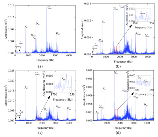 Simulated acceleration signals in frequency domain of gear systems with different faults: (a) Normal gear system; (b) Gear system with cracks; (c) Gear system with pitting; (d) Gear system with cracks and pitting.