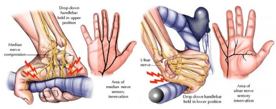 Recent years, cycling has become increasingly popular, not only for cardiopulmonary exercise, but also for medium aerobic exercise, to improve muscle strength and muscle endurance, as well as to enjoy the thrill of riding and enjoying the scenery along the way. The both serious and casual riders, if the riding posture is incorrect, it is easy to trigger soreness or cause sports injuries. As each handlebar of a bicycle has a different stance, this can affect the activation of muscles in the upper body if used on different surfaces for long periods of time, which can lead to injuries [3]. For example, entrapment neuropathy, also known as handlebar palsy, is a condition in which the most common nerves under pressure are the ulnar and median nerves, and is characterised by sensory disturbances. This is mainly due to prolonged gripping of a bicycle handlebar, which compresses the ulnar nerve or the median nerve in the carpal tunnel [9], as shown in Figure 1 [10].