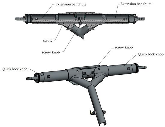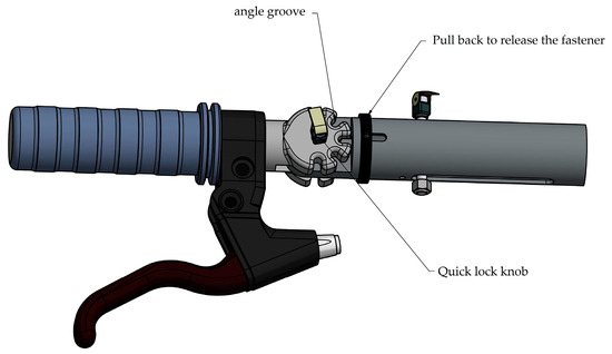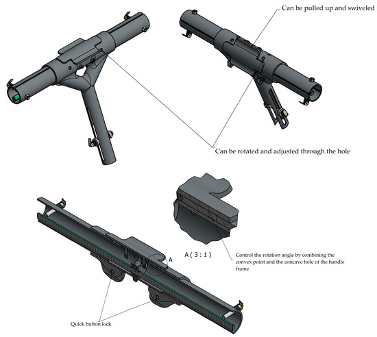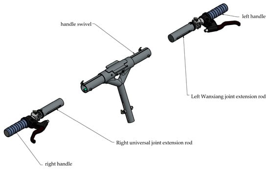 After reviewing the relevant literature in Chapter 2, the following TRIZ invention principles were applied in conjunction with the application of the TRIZ paradox matrix to the invention principles in Chapter 3, using human factors engineering methods and universal design methods: No. 1 (segmentation), using the segmentation principle to divide the handle into five parts: left handlebar, left universal extension, handlebar rotation, right universal extension, right handlebar; No. 15 (dynamic principle), the handle rotates with the lever to No. 16 (partial or excessive principle): the left and right handlebar rotation is adjusted by 30 degrees using the snap mechanism; No.28 (replacement mechanism system), the left and right extension functions are adjusted with screws, as shown in Figure 13 and Figure 14.