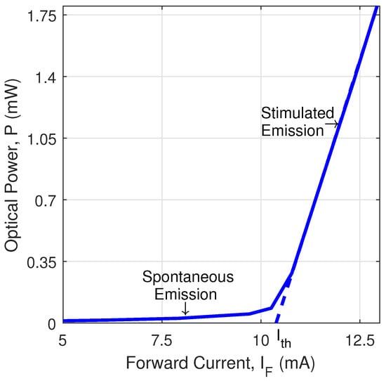 The light–current curves (see Figure 1) show two typical emission zones of semiconductor lasers. These are the spontaneous and stimulated emission zones [8,23]. In most applications, the laser must operate in the stimulated emission zone where the efficiency of the system is maximum and the relationship between the emission power, P, and the forward current, , is linear and described by: