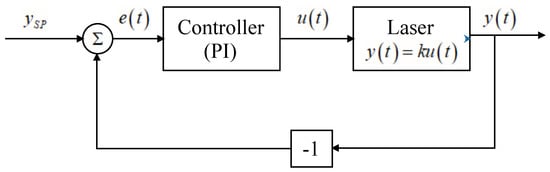 The implementation of a proportional–integral (PI) controller in a laser power driver, which operates with a fixed optical power output at a stable temperature, is described in [11]. However, there are no general design rules for the controller (proportional gain and integral gain ). In addition, there are no studies on the settling time and stability of the controller. This makes it difficult to design a PI controller for a broad operating temperature range and to estimate the settling time a priori. Thus, in this article, we focus on developing the theoretical control rules of PI controllers to stabilize the emitted optical power around a set point. In addition, we implemented the designed PI controller in a microcontroller to evaluate the validity of the theoretical findings.
