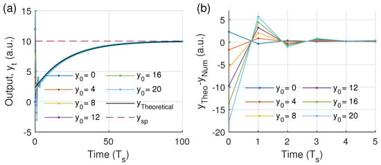 A more general numerical solution can be reached by rewriting the time and integral time in terms of an alternative time unit, such as the sampling period (). Hence, the numerical solution is extrapolated to controllers with different sampling periods. The Figure 3a shows the iterative solution of Equations (20) and (21) contrasted with the theoretical solution of Equations (12) and (13), respectively. Both equations show that the particular solution is independent of the initial conditions. Thus, the trajectory of the system output is unique. Additionally, depending on the initial condition, , the system oscillates around the particular solution with an amplitude that depends on the initial numerical error signal, as shown in Figure 3b. Therefore, when the oscillations become imperceptible the trajectories are similar, and the output shows an exponential decay towards .