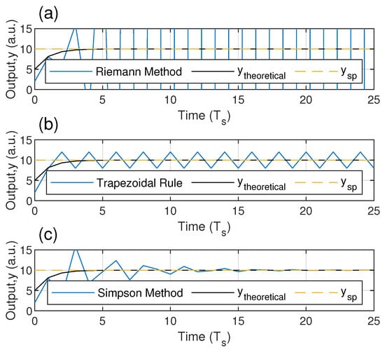 Convergence analysis of the system output at the stability limit conditions (, and ) for numerical controllers by (a) Riemann’s rule, (b) the trapezoid method and (c) Simpson’s rule and , as fixed parameters of the system.