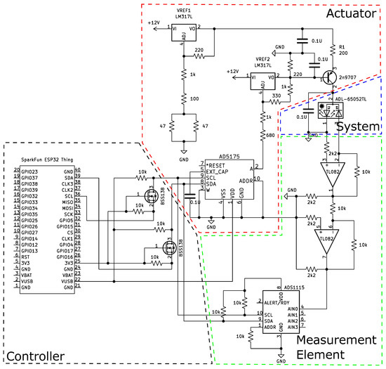 The linearity of the actuator and measurement element relationships are shown in Figure 8 and Figure 9. These linear relationships allow the implementation of a controller using the value of the resistance of the potentiometer as a control signal and the voltage of the trans-impedance amplifier as a feedback signal. Finally, a “Sparkfun ESP32 thing” was used as a controller for its low cost and low power consumption.