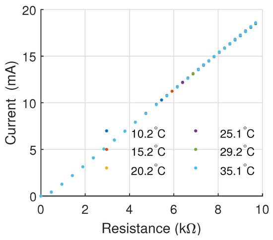 Nevertheless, the minimum should be higher than the maximum laser operating voltage to prevent the transistor from entering the saturated region. In this case, the transistor operates in the active zone, resulting in a linear relationship between the laser supply current and the position of the digital potentiometer (as shown in Figure 8). Finally, is calculated to ensure that the maximum current over the laser remains below the manufacturer’s current limit.