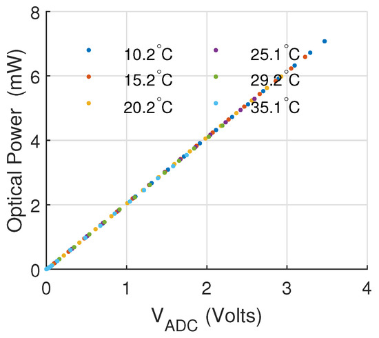Figure 9 shows the calibration of the feedback signal referenced to the optical power measured directly at the output of the laser using a power meter (Newport, Model 840-C) tuned to a wavelength of 650 nm. In addition, the figure shows that the photodiode of the laser is robust to temperature, and thus the calibration is transversal for the sensed temperature range.