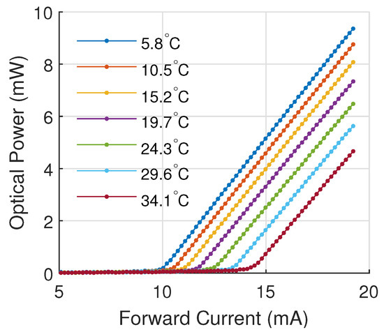Thermal variations generate a shift of the emission spectrum (wavelengths) and a reduction in the quantum efficiency. The emission spectrum undergoes displacements on the order of tenths of nm (wavelengths) by each Celsius degree of variation in the laser operating temperature [8,9,10]. In addition, decreases in the quantum efficiency modify the relation between the laser supply current with the emitted optical power [8,9,11]. These changes can impact the performance of the specific applications. For instance, in optics communications, the signal-to-noise ratio is reduced due to high-frequency instability in the optical power [5]. Moreover, low-frequency instabilities in the emitted power can cause a reduction in detection thresholds, generating an increase in the bit error rate or even a total disruption of the communication.