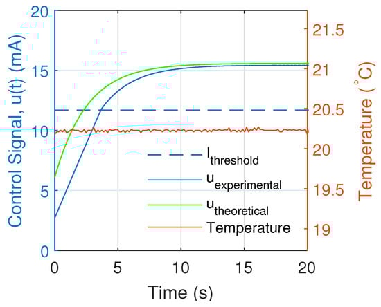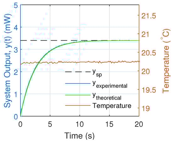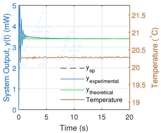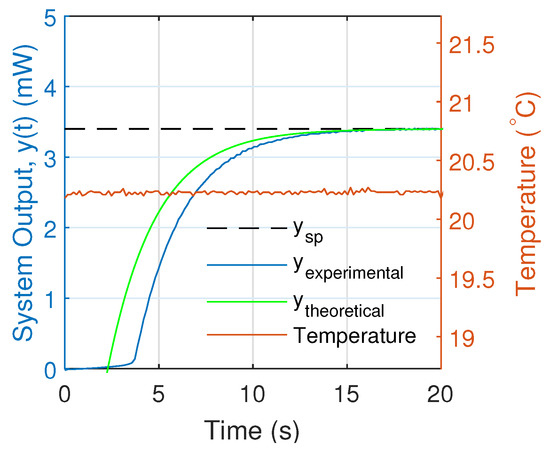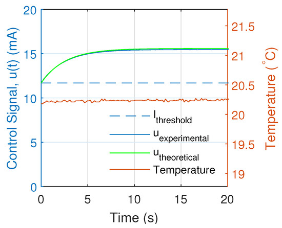 Initially, the response of the system was analyzed with a and an operating temperature of 20.28 °C with a standard deviation of 0.02 °C as shown in Figure 11. There we observed that the theoretical solution did not coincide with the experimental response of the PI controller. This is because the theoretical model of Equation (17) is only valid if the theoretical control signal (Equation (4)) is greater than the threshold current at the operating temperature which is approximately mA.