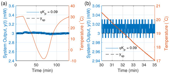 However, the model can guarantee the system stability when the thermal variations are less than ∼1 °C per minute (0.017 °C/s) and if the chosen control gain complies with the condition of Equation (24) in the new operating temperature (see Figure 18).