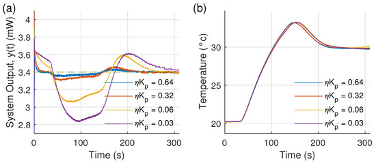 Robustness of the experimental system output (a) for different from 0.03 to 0.64, s and mW, under thermal disturbances (b).
