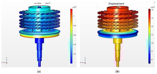 Von Mises stress and deformation distribution of the rotor. (a) Von Mises stress; (b) deformation distribution.