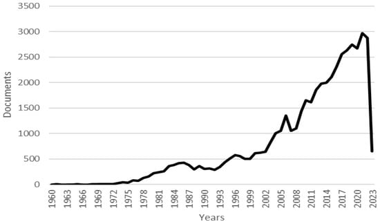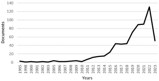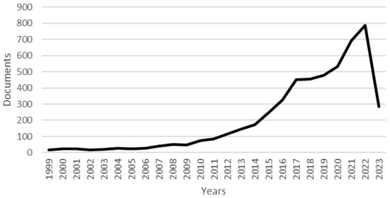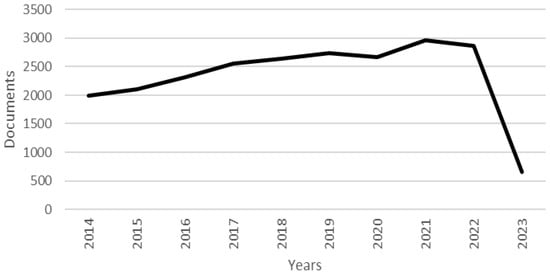 As Figure 1 shows, the number of publications related to “retrofit*” has increased significantly since around 2014 (there are about 2000 articles written in that year, and the production of articles since 2014 has been growing faster and faster). In fact, in 2011, the concept of “Industry 4.0” was presented for the first time. In the following years, concepts such as the Internet of Things, Cyber-Physical Systems and machine learning algorithms began to be applied []. These technologies have certainly given a boost to the application of retrofitting. For this reason, it was decided to narrow the search to a period between 2014–2023 (Figure 2). With this new filter, 23,502 documents were identified.