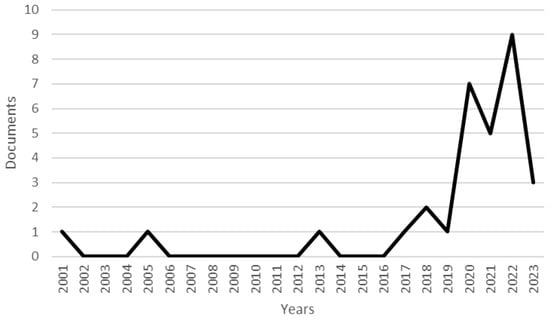Analysing the trend of publications by year for both keys, there is an increase after 2014. Therefore, for the same reasons as in the previous case, articles published between 2014–2023 were taken into account. This filter reduced the number of documents found to 4425 and 667, respectively. The two research results’ abstracts, introductions and conclusions highlighted 20 and 9 papers as being of interest, and these were selected.