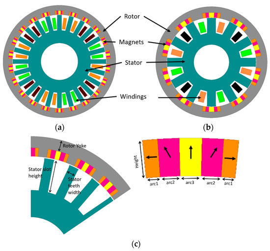 This section proposes a new configuration of the Halbach array with five-segment PMs to increase the torque density and PF, which is shown in Figure 2 for two slot pole combinations (24 s/44 p and 12 s/20 p).