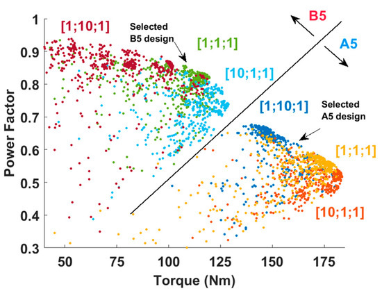 The optimization results are presented in Figure 3 and Figure 4 for A5 and B5 designs. As expected, A5 HAPMVM can reach higher torque while B5 can reach higher PF. A5 HAPMVM can be designed to reach 180 N·m with a power factor of around 0.55 or to reach a power factor of 0.7 with a torque output of 120 N·m, whereas B5 HAPMVM can be designed to reach 120 N·m with a power factor of around 0.75 or to reach a power factor of 0.9 with a torque output of 80 N·m.