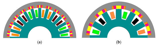 By taking in (3) for a four-pole machine (), the number of rotor poles will be or 28. Similarly, by taking for a four-pole machine (), the number of rotor poles will be or 52. It is shown in [13,14] that the minus value in (3) creates a higher equivalent winding factor and consequently a higher back EMF and torque. Hence, by taking only minus operations in (3), the resultant numbers of poles are 12 slots/20 poles and 24 slots/44 poles [13,14]. These slot/pole combinations are assumed in this study. The 24 slots/44 poles designs are called model A and 12 slots/20 poles designs are called model B.