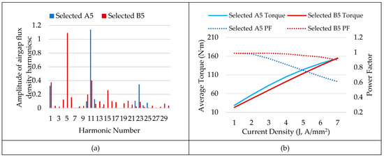 The harmonics of the airgap are displayed in Figure 5a. A5 design utilizes 1st, 11th, and 23rd harmonics to generate positive torque, while B5 design utilizes 1st, 5th, and 11th harmonics. Moreover, from the harmonic spectrum, it can be inferred that B5 design has a higher harmonic content in the airgap, which results in higher torque ripples. The torque outputs and power factors of selected designs at various operating current densities are compared in Figure 5b. The results show that PFs of both A5 and B5 designs are better at lower current densities. Plus, A5 design has an acceptable PF (>0.8) up to A/mm2, where a torque of 105 N·m can be reached, and this torque value is sufficient for most of the driving experiences, as shown in Figure 1.