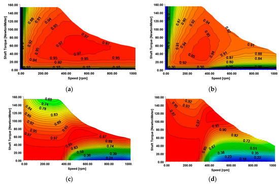Performance of selected designs in a wide speed range (including constant torque and constant power regions): (a) efficiency map of A5 design; (b) efficiency map of B5 design; (c) power factor map of A5 design; (d) power factor map of B5 design.