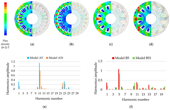 Flux path and flux density of Halbach array (A5, B5) and single magnet counterpart (A51, B51) designs at open circuit (a–d) and their airgap flux density harmonics (e,f). (a) A5 design; (b) A51 design; (c) B5 design; (d) B51 design; (e) harmonics of airgap flux density for A5 and A51 designs, dominant working harmonics to generate positive torque are 1st, 11th and 23rd; (f) harmonics of airgap flux density for B5 and B51 designs; the dominant working harmonics to generate positive torque are 1st, 5th, and 11th.