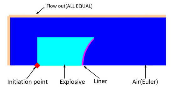 Composition JH-2 was used for explosives; it is described by the Jones–Wilkins–Lee state equation, and the parameters are shown in Table 1. OFHC Cu was used for the liner; 921A steel was used for targets; Both of them are described by the JOHNSON_COOK material model and GRUNEISEN state equation, and the parameters are shown in Table 2 and Table 3.