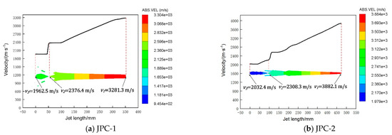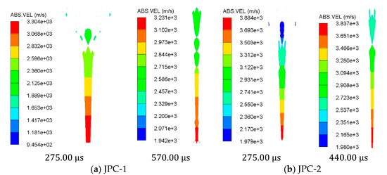 The jet is impacted and extruded at the axis, and the tip velocity increases to the maximum velocity. As the spherical detonation front reaches the liner top, the liner starts collapsing. The detonation pressure drives the liner to keep turning and deforming. The whole liner collapses on the axis, and the jet velocity reaches the peak. At this time, the inside of the metal at the liner top has been turned to the outside and became the jet tip. Later, due to the velocity difference between the tip and tail, the jet continues to stretch and becomes thinner. The two charges with different configurations generate two forms of JPC. JPC-1 comes from the shaped charge without a wave shaper and JPC-2 from the one with a wave shaper. The velocity contours of the two JPCs are shown in Figure 3.