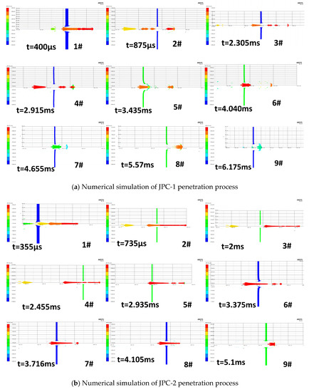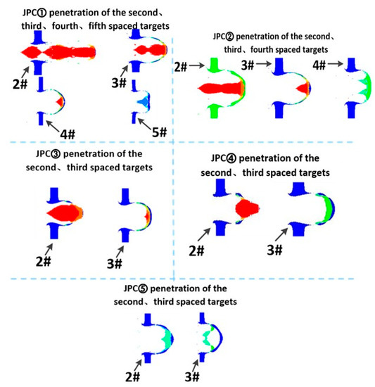 The processes of the JPCs penetrating into the multi-layer spaced targets are shown in Figure 6. To reduce the calculation time, the targets are successively added to the test, and calculation is conducted to the overall penetration process. The targets are numbered according to their sequence of being perforated by the JPC.