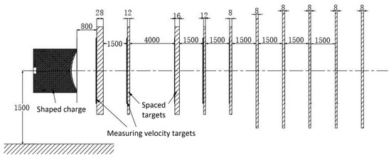 To verify the simulation results, the experiments of the two shaped charges with different configurations penetrating into multi-layer spaced targets discussed in the previous section are carried out. The shaped charges, the thickness of the targets, and their spacing in the test are the same as those in the numerical simulation. The experimental setup is shown in Figure 8. In addition, for each round of projectile in the test, the first four targets are all equipped with velocity-measuring targets to measure the flight velocity of the JPCs and the behind-target residual velocities.