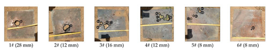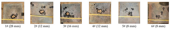 The statistical analysis of the penetration hole diameter and distribution on the spaced targets after the two experiments are presented in Figure 10 and Figure 11 and Table 5. From the perforations, except for a small amount of collapsed jet, in the two cases, all the JPC passes through the same holes. In addition, the first three holes have good coaxials, the size of the main hole in each target is also large, and the jet has no obvious deviation. After the JPC exits the third target plate, its flight distance reaches 7.856 m. It is found that the holes in the fifth target are seriously dispersed, indicating that the JPC segments after breakup have deviated from the flight axis, and the hole diameters have been markedly reduced. To better illustrate the distribution of the broken jet particles on the spaced targets, the main hole in each target is numbered, and their sizes are listed in Table 5.