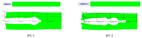 Due to the different tip velocities and velocity gradients of the JPCs, their breakup time also differs. From the simulation results, the JPC-2 tip velocity is increased due to the existence of a wave shaper, its velocity gradient, and length are also increased, and its jet section is more slender compared with that of JPC-1 (without wave shaper), so JPC-2’s tensile breakup time is earlier, and its necking and breakup occurs at 440.00 ; JPC-1’s breakup time is about 590 .
