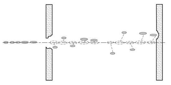 The experimental results show that the transverse drift and dispersion of the broken jets are very apparent during the penetration process of the JPC at high stand-off distances. As a result, the jet deviates from the charge axis, part of the jet collides with the penetration hole wall, and even multiple jet segments penetrate along different paths, causing great losses and greatly reducing the subsequent penetration capability. Therefore, a jet breakup cannot be ignored in the case of penetrating the spaced targets. This can explain the large error between the simulation and experimental results. Figure 13 shows the transverse drift of the jet during penetration into the spaced targets.
