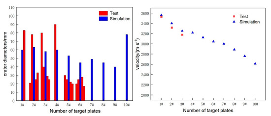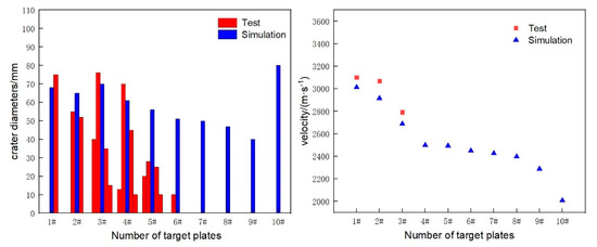 Figure 14 and Figure 15 give the comparison of the size and number of penetration holes in the experiment and simulation, and the comparison of the jet velocity during penetrating into the first three layers of a target. It can be seen that the impact velocity of the JPCs measured in the experiment and that in the simulation have a small difference. It can be considered that the calculation result of jet tip velocity is relatively accurate. However, the number and size of holes in the experiment are different from those in the simulation. In the test, the JPCs formed by the two charges with different configurations only penetrate six layers of spaced targets, which is far less than the simulation result that the JPCs still have residual penetration capability after penetrating nine layers of targets.