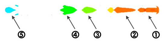 In the simulation, due to the short flight distance to the first target, an apparent breakup occurs to the JPC after it perforates the first target. Therefore, taking the penetration test results of the JPC-1 as an example, the JPC segments after the breakup (at 790 ) after the JPC perforates the first target is labeled as ①, ②, ③, ④, and ⑤ from right to left as shown in Figure 17. It is assumed that once the JPC breaks up into segments, they will deviate from the original trajectory. Therefore, each segment is extracted separately to calculate their respective penetration into each target. The simulation process of segment penetration is presented in Figure 18.