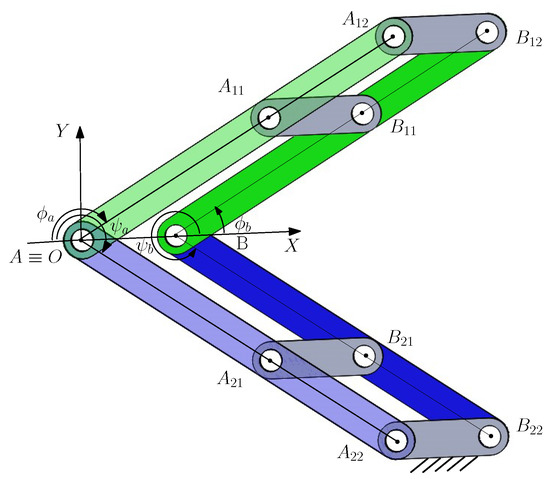 To facilitate the identification of the geometric characteristics of the 8-link mechanism, the coordinate system O-XY is set up such that O coincides with R joint center A, and R joint center B is located on the positive X-axis. Let () denote the angle between the negative direction of the X-axis and the link AA (AA) measured clockwise and () the angle between the positive direction of the X-axis and the link BB (BB) measured anti-clockwise. An auxiliary variable, (), is introduced to simplify the reconfiguration analysis.
