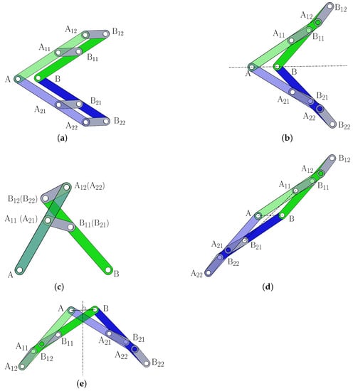 Equation (4) represents a 2-DOF motion mode, motion mode 1 (Figure 2a), of the 8-link mechanism. In motion mode 1, both closed-loop 4R kinematic sub-chains, ABBA and ABBA, are parallelograms. Throughout the remainder of this paper, including Figure 2, line AB will be kept in a horizontal position by releasing the frame. This is to ensure that the geometric characteristics of the 8-link mechanism are clearly illustrated.