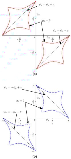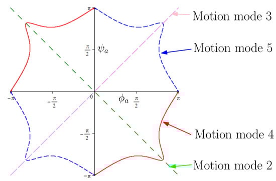 It can be observed that if (, , ) is a set of solution to Equation (5), then (, , ) are also solutions to Equation (5). Since , the − curve for motion mode 4 (or 5) (see Figure 3) is only one half of the curve obtained using Equation (12) (or Equation (13)) that lies outside of the region enclosed by lines (or ). In other words, in motion mode 4, we have or . In motion mode 5, we have or .