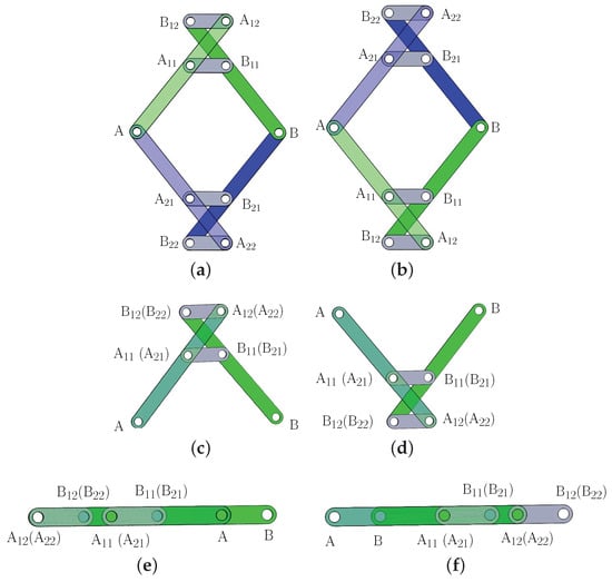 Equation (10) represents a 1-DOF motion mode, motion mode 3 (Figure 2c), of the 8-link mechanism. In motion mode 3, both closed-loop 4R kinematic sub-chains, ABBA and ABBA, coincide, and the 8-link mechanism has two inactive joints A and B. Motion mode 3 is called the planar 4R mechanism mode because, in this motion mode, the 8-link mechanism degenerates to a planar 4R mechanism.