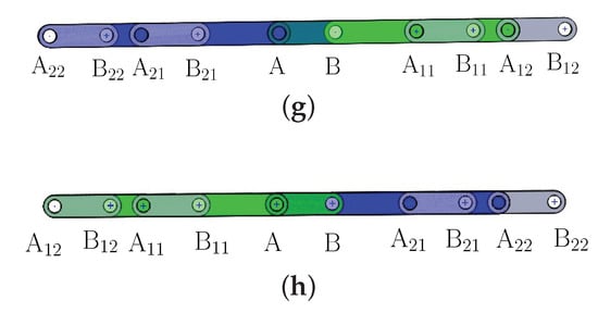 The 8-link variable-DOF planar mechanism in transition configuration: (a) T(2 ⋀ 4); (b) T(2 ⋀ 4); (c) T(3 ⋀ 5); (d) T(3 ⋀ 5); (e) T(1 ⋀ 2 ⋀ 3); (f) T(1 ⋀ 2 ⋀ 3); (g) T(1 ⋀ 4 ⋀ 5); and (h) T(1 ⋀ 4 ⋀ 5).