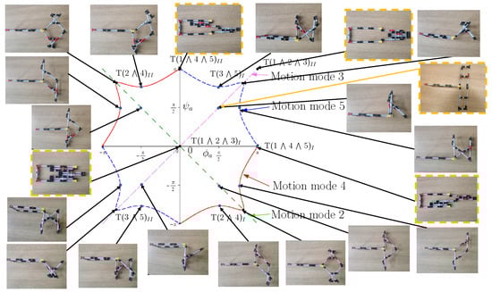 Figure 6 illustrates the reconfiguration of the 8-link planar mechanism among the five motion modes via the eight transition configurations in the plane. The curves in the plane of the four 1-DOF motion modes, motion modes 2, 3, 4, and 5, are shown in green, pink, red, and blue, respectively. The 2-DOF motion mode, motion mode 1 in which , covers the whole plane. However, the 8-link mechanism can only transit among motion modes 1, 2, and 3 at two transition configurations T(1 ⋀ 2 ⋀ 3) and T(1 ⋀ 2 ⋀ 3) and among motion modes 1, 4, and 5 at two transition configurations T(1 ⋀ 4 ⋀ 5) and T(1 ⋀ 4 ⋀ 5) since we have in the other configurations in motion modes 2, 3, 4, and 5.