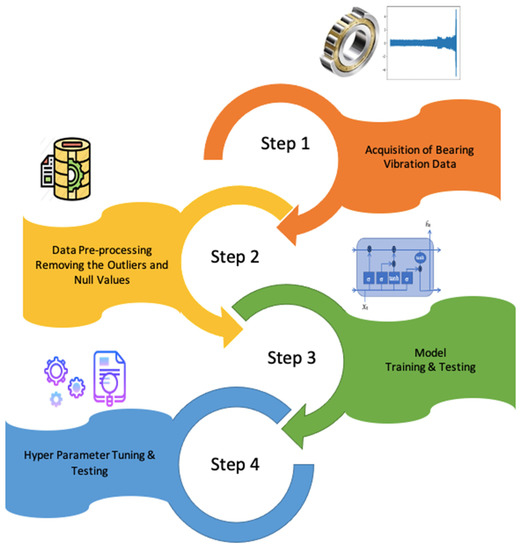 One of the most important components in industrial machines are bearings, which normally operate under a very stressful environment and, hence, are continuously prone to degradation [1]. Thus, bearings are among the few critical and foremost fault-causing components in electro-mechanical systems [2]. When aged, faults like bearing wear and tear and symptoms, such as abnormal vibrations, high temperatures, and misalignments, are introduced into the system. Therefore, a predictive approach toward fault identification is necessary in modern, industrially-revolutionized times to avoid forced downtime.
