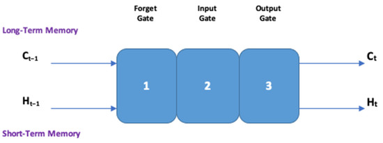 LSTM was first presented in 1997 by Hochreiter and Schmidhuber [43]. It is a type of RNN that can effectively establish a correlation between a priori information and the current state based on a time series. The proposed LSTM network comprises three basic components, the Forget gate, Input gate, and Output gate, as shown in Figure 2. These components are used to (1) Forget irrelevant information, (2) Add/Update new information, and (3) Pass on the updated information.