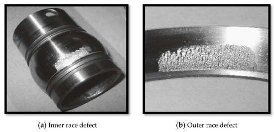 Figure 5a depicts Bearing 3 with an inner race fault at the end of the experiment recorded as Dataset 1. Figure 5b shows Bearing 1 with an outer race fault at the end of the experiment recorded as Dataset 2.