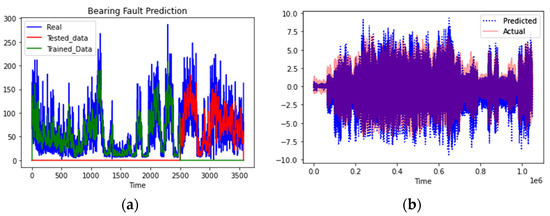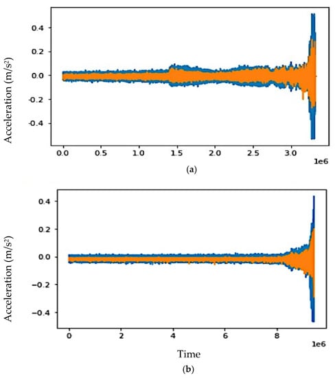 The performance of the developed LSTM model against the proposed approach was first analyzed on Dataset 02. Figure 8a shows the plot of the predicted and actual bearing vibration values. The blue color represents the actual bearing vibrations, whereas the orange color represents the predicted values. The proposed model precisely predicted the normal values and followed the degradation trend until a fault, which was also efficiently predicted. The RMSE value recorded for the Dataset 02 was 0.0145. Considering the mean vibration value, this RMSE reflects that the error in the predicted and actual values is less.