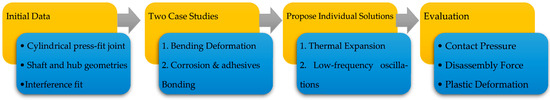 This study focused on investigating two common problems that arise during the disassembly process: deformation and corrosion of the mating components. To address these issues, thermal expansion and vibration-assisted disassembly techniques were examined. The research team developed a baseline model of an interference fit and validated it using literature data. The model accounted for normal wear of the joint and considered two scenarios: deformation caused by bending of the connected parts and an increase in COF due to corrosion. The study explored various approaches to reduce the pull-out force, minimize plastic strain in the parts, and prevent damage during and after disassembly. Figure 1 provides a block diagram of the modelling sequence used in this study.