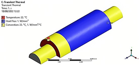 To facilitate disassembly through thermal expansion and reduce contact stress, an even heating process was applied to the hub. This approach is similar to shrink fitting, where a transient heat is applied to the hub during assembly, causing it to shrink while cooling after assembly [28]. Since the hub has a significantly larger surface area than the pin, the expansion of the hub would have a greater effect. To simulate actual heat transfer during disassembly, a transient thermal analysis was performed using Ansys Workbench 2021, as illustrated in Figure 4. A heat flux was applied to the exterior of the hub, and both ends were assumed to be at room temperature, with convection taken into account. The initial temperature was maintained at 22 °C, and a displacement of 4.5 mm was applied to the shaft. The Ansys model implemented the mechanical and thermal properties of S235 steel at different temperatures, obtained from the literature [29], and these are presented in Figure 4. The study investigated the effect of thermal heating within a temperature range of less than 300 °C, as both the yield strength and Young’s modulus of the alloy decreased with increasing temperature. The elasticity was determined by Young’s modulus (E) and the tangent modulus, with the model keeping the latter constant. Young’s modulus is a measure of a material’s stiffness under axial tension or compression and is calculated as the ratio of stress to strain within the proportional limit. It is a constant value for a given material and is independent of the magnitude of the stress applied. By contrast, the tangent modulus is a measure of the local stiffness of a material at a specific point on its stress–strain curve and is calculated as the slope of the curve at that point. Unlike Young’s modulus, the tangent modulus is not a constant value but varies depending on the level of stress applied. It is worth noting from Figure 4 that the thermal conductivity decreased by more than 13% after 300 °C, leading to less efficient heat transfer. Additionally, the tensile strength also experienced a drastic decline after 300 °C. Therefore, a heat flux in the range of 0.5 to 2 W/mm2 was applied to avoid violating this constraint and keeping the part’s temperature below 300 °C, as shown in Figure 4. The study determined the plastic strain, contact pressure, and disassembly force resulting from the transient thermal analysis.