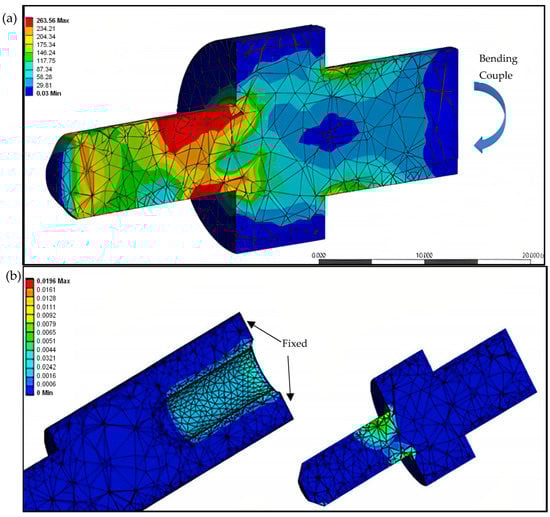 Interference fits can lead to bending and torsion of the mating components, which increases their susceptibility to fretting and fatigue [13]. Peaking stress occurs when the shaft and hub are subjected to bending loads, resulting in relative motion between them. Torsion only increases shear motion but may cause plastic deformation under high-stress conditions when slipping is prevented. According to Radi et al. [8], the mating parts experience increasing pressure at the concave side and vice versa. The detachment bending couple is the moment needed to detach a hub from a shaft due to frictional forces at the interface. A mathematical model has been derived to calculate the detachment couple C of a shaft-hub interface fit as shown in Equation (1), where E is the Young’s modulus, I is the diametrical interference, I1 is the moment of inertia, and a is the shaft radius. The detachment couple is then applied to the shaft, as shown in Figure 3, while the other end of the hub is fixed. The primary objective of this study is to prevent the increase in plastic deformation at the shaft/hub interface during disassembly, which is crucial for ND.