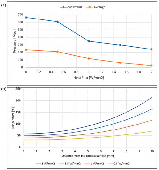 The change in contact pressure with increasing applied heat flux is analyzed using Figure 7a. The maximum and average pressures are observed to decrease significantly as the heat flux is increased. Initially, with no heat applied, the maximum and average pressures are approximately 680 MPa and 230 MPa, respectively. However, at a heat flux of 2 W/mm2, these values drop to approximately 250 MPa and 30 MPa, respectively. These results are consistent with those reported by Sen et al. [29], who observed similar trends in both radial and hoop stress under the application of thermal energy. The reduction in contact pressure can be attributed to the thermal expansion of the hub and shaft, which reduces the compressive forces between the two components. Additionally, the local increase in temperature causes a decrease in the modulus of elasticity and an increase in the coefficient of thermal expansion, which further contributes to the reduction in contact pressure. It is important to note that the reduction in contact pressure can have significant implications for the structural integrity of the joint. In particular, it can increase the risk of fatigue failure and reduce the lifespan of the joint. Therefore, it is essential to carefully consider the effects of thermal loading when designing and analyzing mechanical joints.