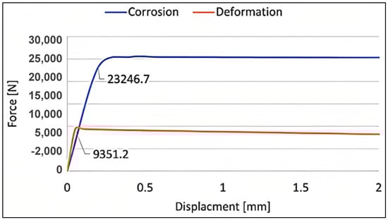 Baseline disassembly force for the deformed and corroded joints; labelled breaking force at 0.1 mm displacement.