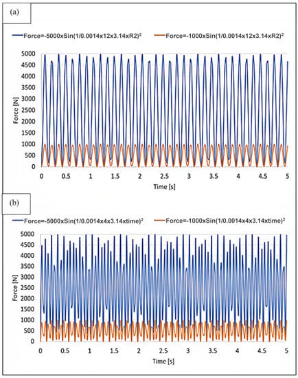 The S235 alloy, being a mild steel, is vulnerable to uniform corrosion when exposed to humid air. Previous studies by Gassama et al. and Kocanda et al. have shown that the coefficient of friction (COF) increases significantly when wear occurs in seawater [31,32]. These studies assumed that no anti-corrosion coatings were applied to the contact surfaces of the joint. In line with these findings, a COF of 0.6 was used in the current study for ANSYS static structural analysis. The selection of the coefficient of friction (COF) value of 0.6 was carefully considered and based on a thorough literature review and common industrial practices for similar applications. This value falls within the typical range for metal-on-metal contacts, such as those found in automotive components, and has been widely used in simulations and experiments related to remanufacturing processes. The wear effect was considered a combination of mechanical, abrasive, and corrosive factors, while the effects of time-dependent corrosion and loss of material were neglected. Previous studies by Dieudonné et al. and Gutowski et al. investigated the impact of longitudinal vibrations on friction forces in sliding motions [15,21]. Both studies applied oscillations of different frequencies to the support to simulate the acceleration force exerted on the hub in the same axis of sliding motion (i.e., the z-axis in this FEM). In this study, vibration waves were applied as sinusoidal forces described by two functions presented in Equations (2) and (3). The force F varied with time t, and two different vibration amplitudes (1000 N and 5000 N) were considered while the frequency remained constant.